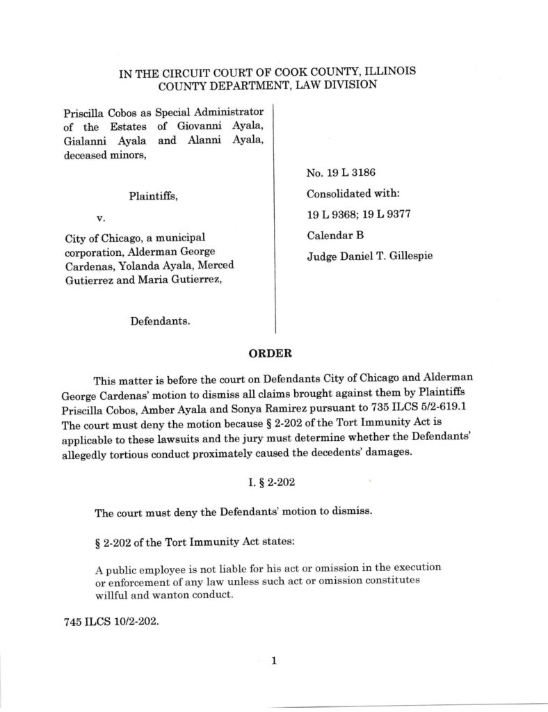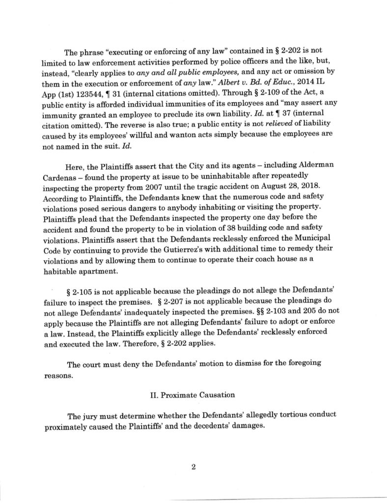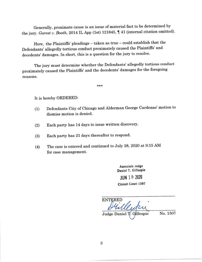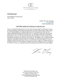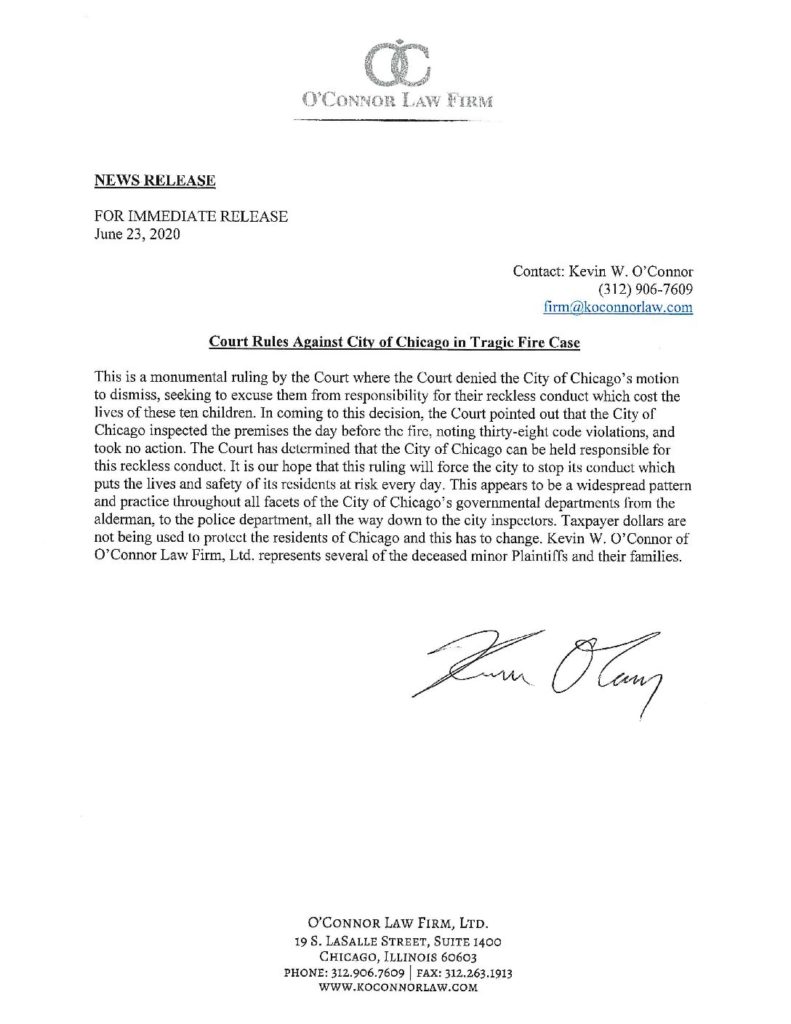 This is a monumental ruling by the Court where the Court denied the City of Chicago’s motion to dismiss, seeking to excuse them from responsibility for their reckless conduct which cost the lives of these ten children. In coming to this decision, the Court pointed out that the City of Chicago inspected the premises the day before the fire, noting thirty-eight code violations, and took no action. The Court has determined that the City of Chicago can be held responsible for this reckless conduct. It is our hope that this ruling will force the city to stop its conduct which puts the lives and safety of its residents at risk every day. This appears to be a widespread pattern and practice throughout all facets of the City of Chicago’s governmental departments from the alderman, to the police department, all the way down to the city inspectors. Taxpayer dollars are not being used to protect the residents of Chicago and this has to change. Kevin W. O’Connor of O’Connor Law Firm, Ltd. represents several of the deceased minor Plaintiffs and their families.
